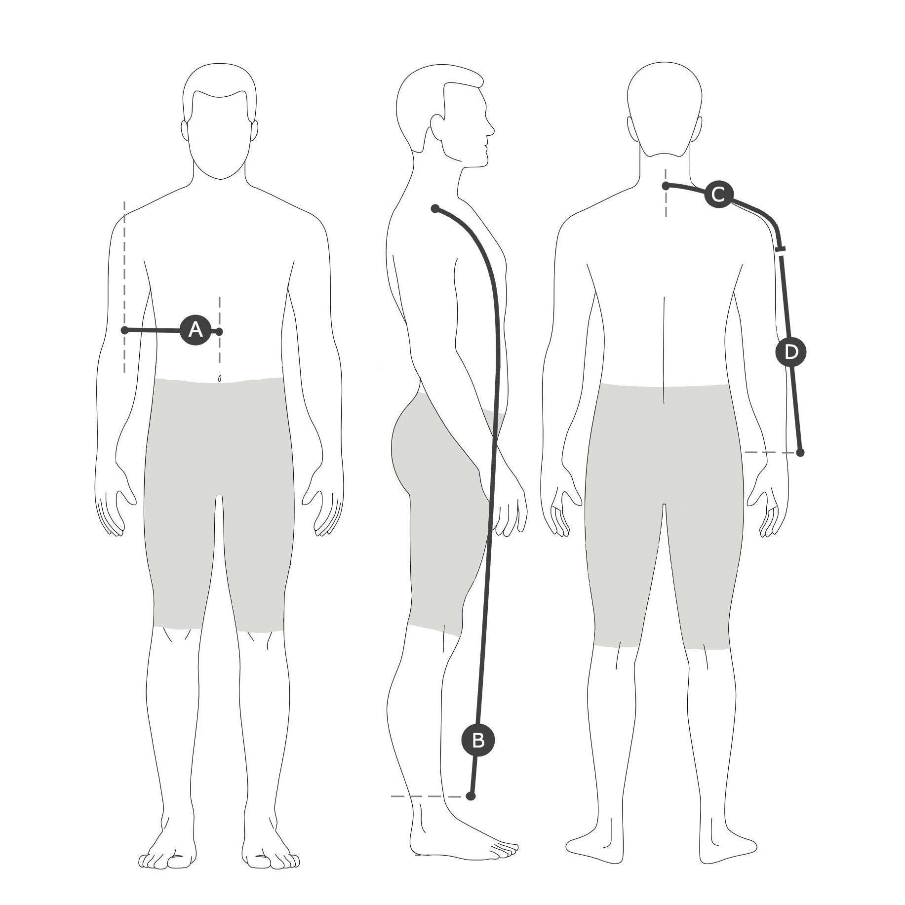 Begin at the point where you ended the measurement for Length C. Measure along the length of your arm down to your wrist. Ensure the measurement is not too long, as the garment will naturally fall slightly longer over the arms.